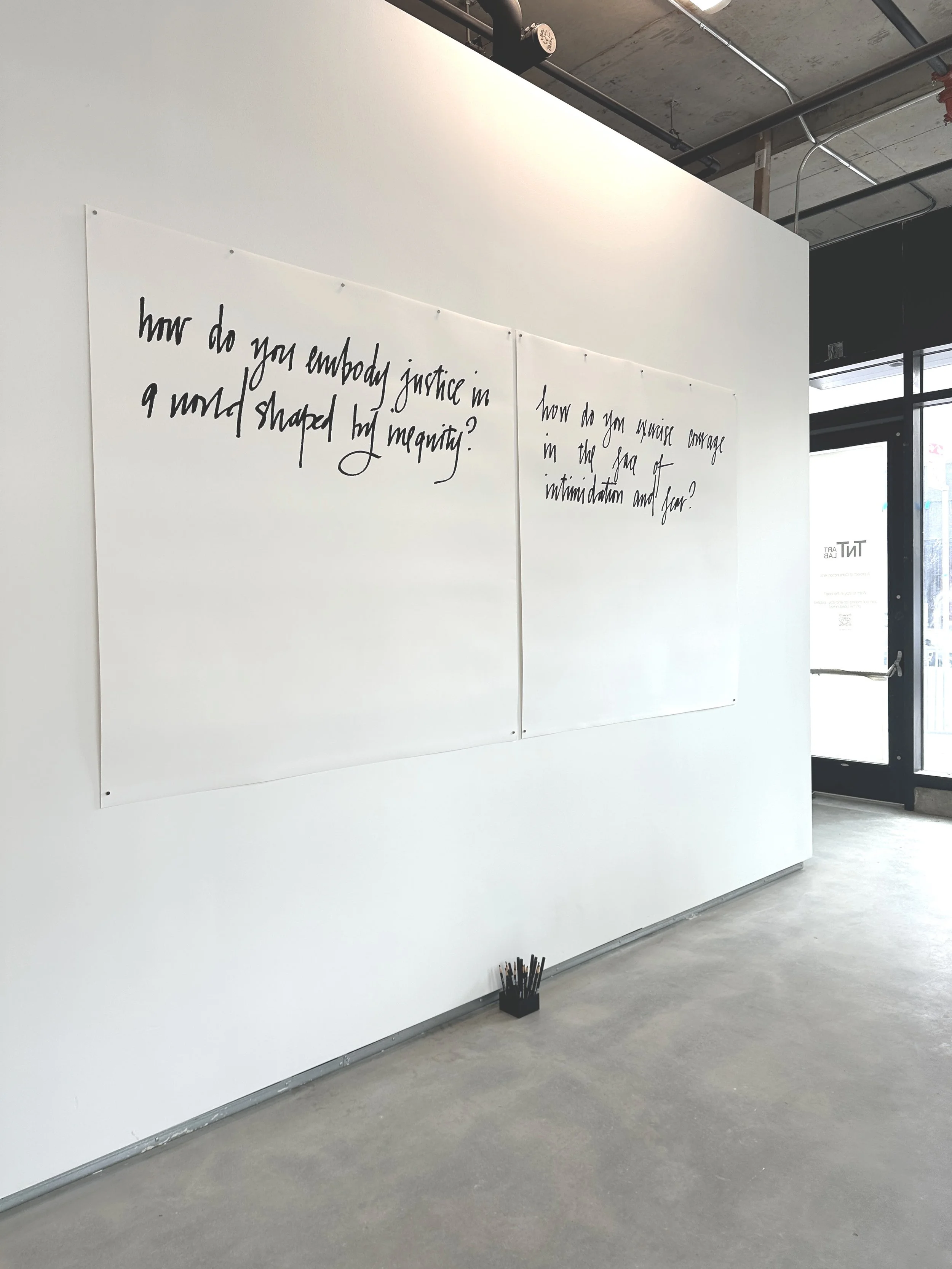 Courage, 2025 is part of TNT Art Lab’s inaugural exhibition Ritual and Resistance. Courage is a community driven participatory activation that invites visitors to shape the work, resulting in a living archive of collective values. The work asks viewers to reflect on the following questions and write their answers directly on sheets of paper.