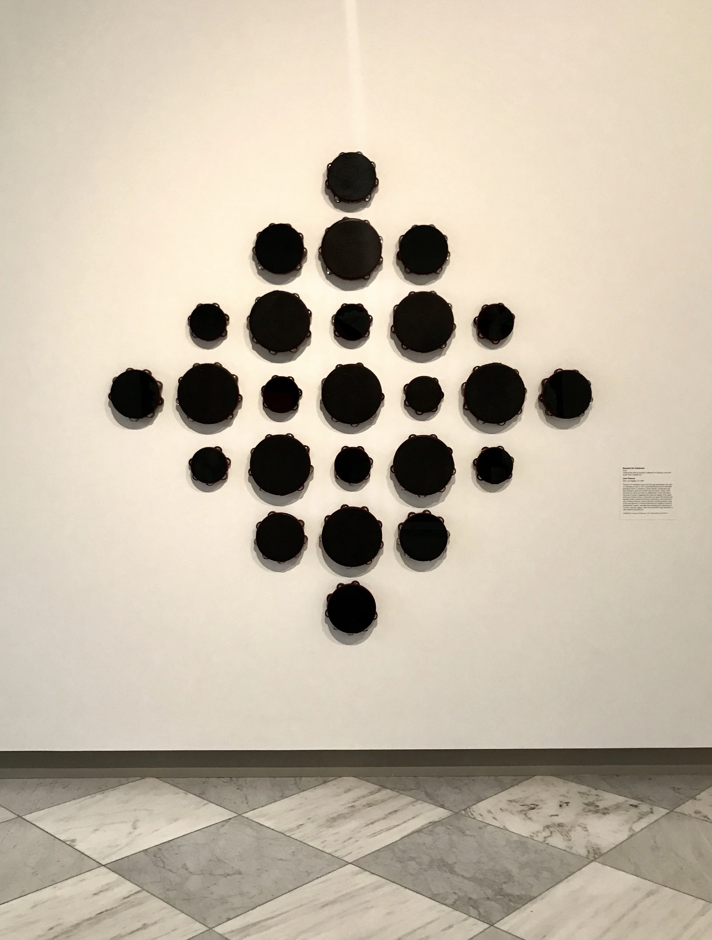 Requiem for Charleston honors the nine men and women who died in a shooting on June 17, 2015, inside the Emanuel African Methodist Episcopal Church in Charleston, South Carolina. Tambourines with black lambskin heads are inscribed with the victims' names, while the drums of others are made of polished black acrylic that reflect the faces of viewers, suggesting the collective tragedy of the attack. Artist Lava Thomas chose to memorialize the dead with tambourines because of their cultural and historical significance, particularly their role in African American musical traditions--including protest songs of the civil rights era. In the days following the Charleston massacre, tambourines, cymbals, and bells rang throughout the community as a call for unity and support. Here the instruments hang motionless, in silent tribute to the lives lost.